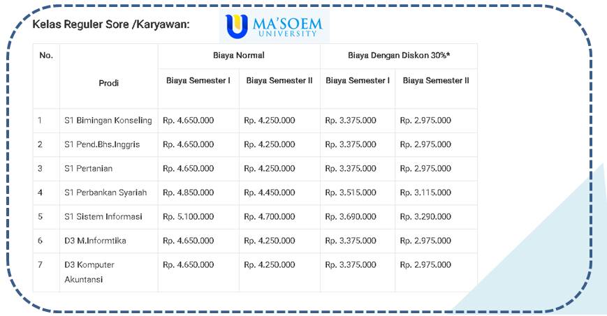 Untuk biaya yang harus anda bayar pada tiap semesternya adalah jumlah biaya dari ketiga komponen biaya dari biaya dp3 biaya kuliah dan biaya bp3. Sumbangan dari orang orang cukup untuk menutupi semua biaya kuliah termasuk uang kuliah sebesar 15000 setiap tahun dan juga program makan siang bersubsidi pemerintah yang menyajikan makanan hangat untuk siswa setiap hari. Biaya terjangkau dan tanpa batasan umur.